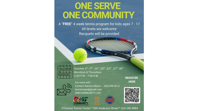 Free 4 week tennis program for kids ages 7-17 will be held October 6th, 9th, 16th, 20th, 23rd, 27th, & 30th. For more information contact Katrina Wilson at (334) 398-0612. or tennismgm@gmail.com.