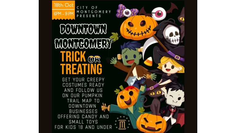 Enjoy trick or treating downtown Montgomery on Saturday, October 18th from 6p-9p. Only for kids 18 and under.