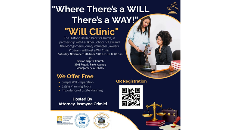 Beulah Baptist Church in partnership with Faulkner School of Law and Montgomery County Volunteer Lawyers will host a "Will Clinic" on Saturday, November 15th from 9am-12pm. Free insight on will preparation, estate planning tools, and the importance of estate planning. This event will be hosted by Attorney Jasmyne Crimiel.