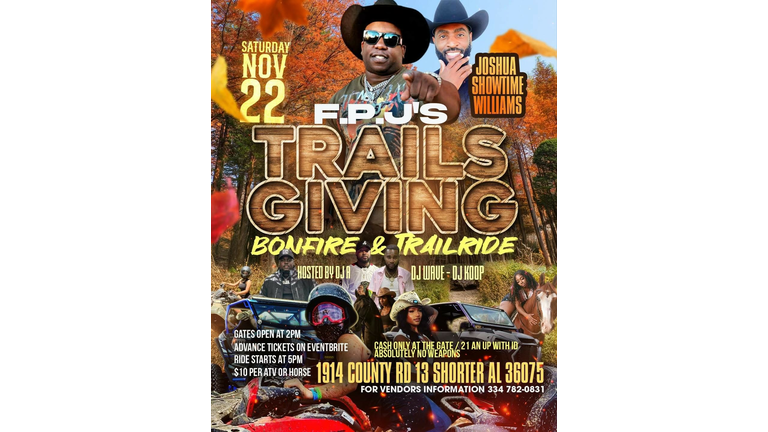 Southern Soul artist F.P.J. presents Trailsgiving Bonfire & Trailride on Saturday, November 22, 2025. This event will be held in Shorter, AL with gates opening at 2pm and the ride starting at 5pm. For more information about tickets and vendors contact 334-782-0831.
