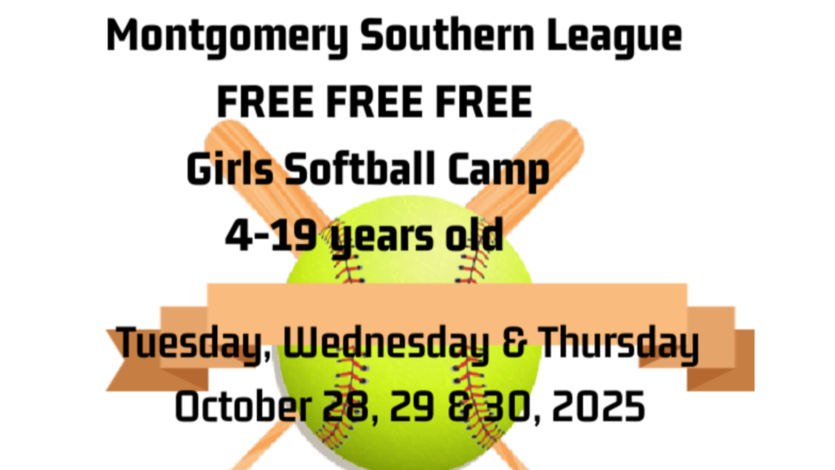 Montgomery Softball League will host a Free Girls Softball Camp from October 28–30 at 6:00 PM – 8:00 PM at Peter Crump Softball Field. Ages 4–19 are encouraged to participate. Contact Barbara Smith, President, at 334-354-4155 for more information.